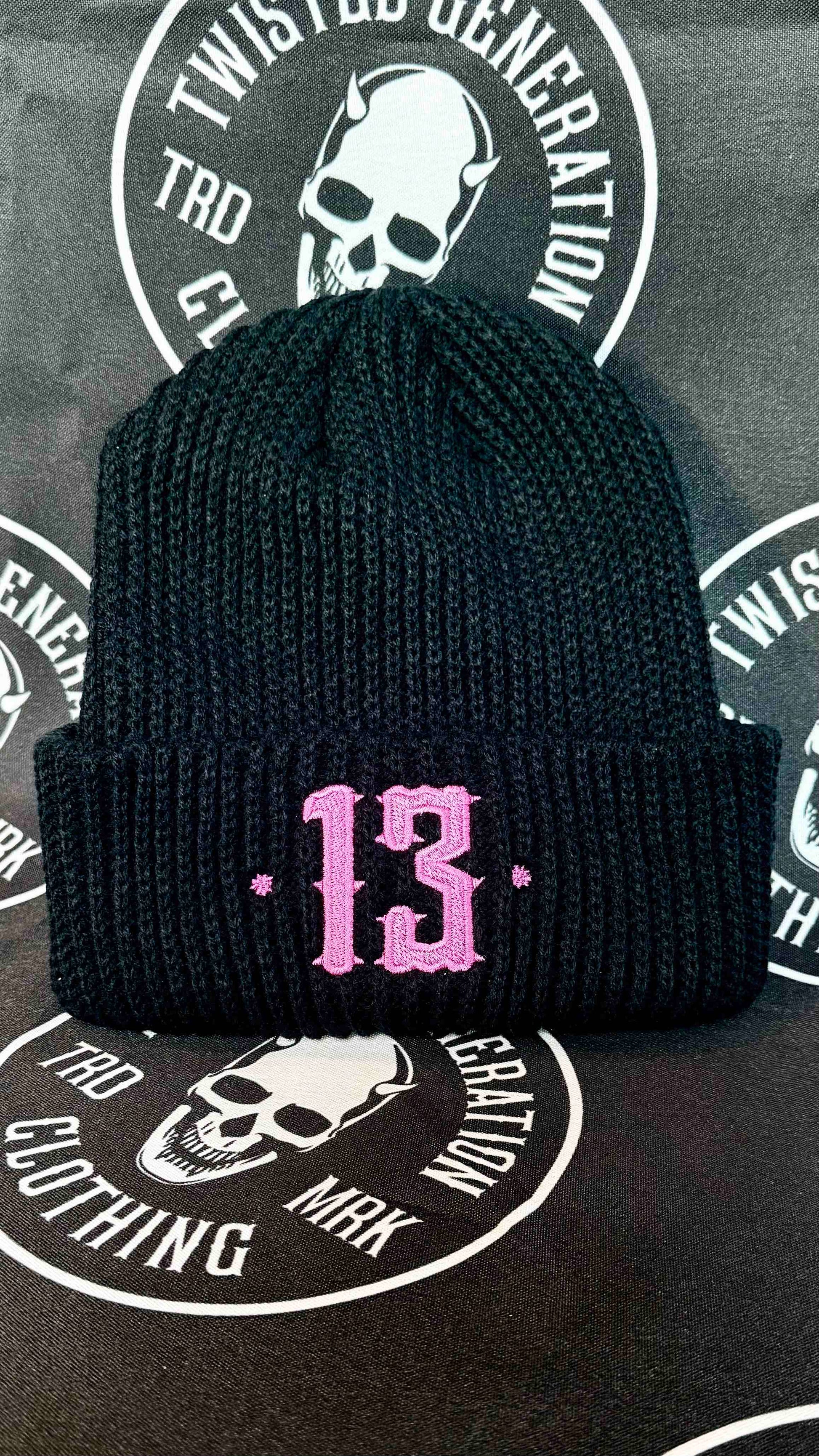 Black beanie with pink embroidered 13 logo.
