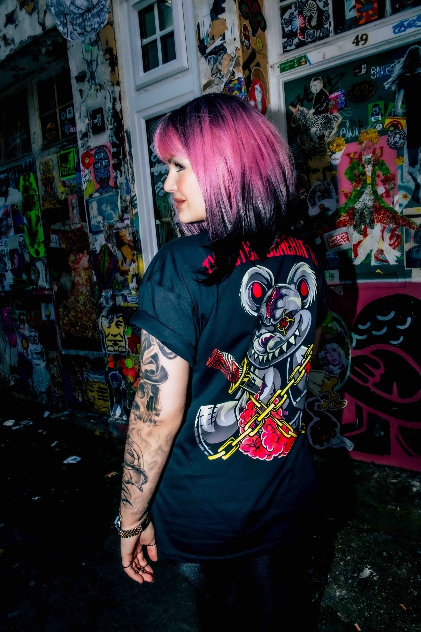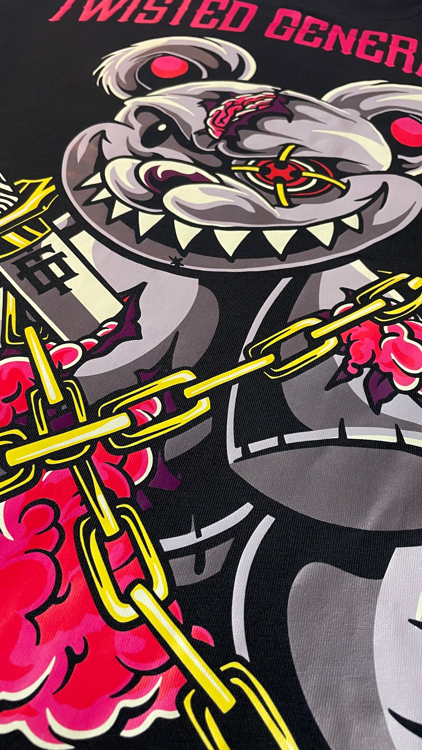 It features a small side chest print on the front & an extra-large Psycho Teddy colour print on the back.
