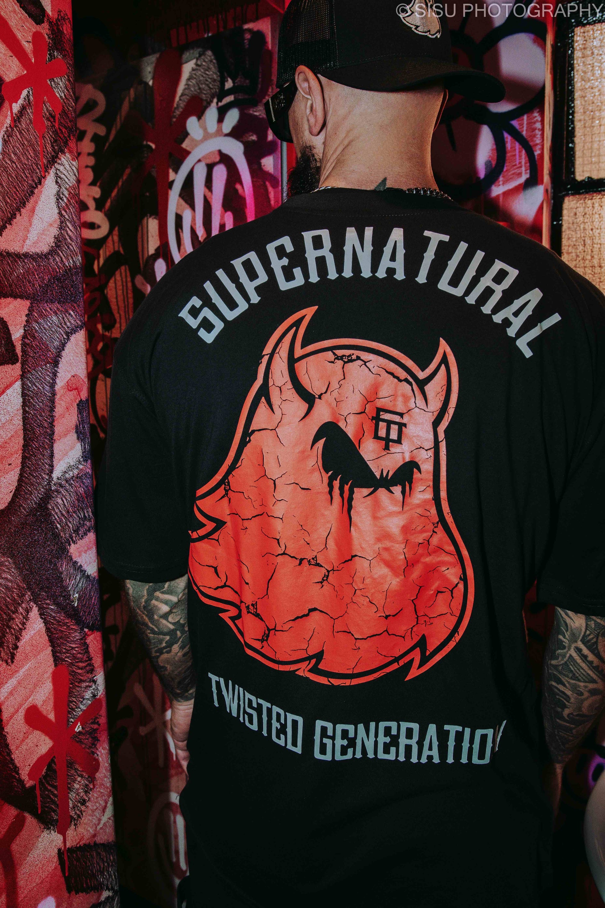 It features a small side chest print on the front & an extra-large Supernatural print on the back.